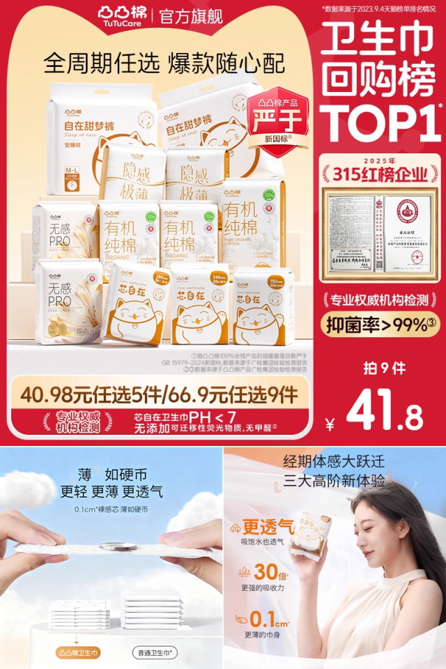 任选9件叠加淘金币到手35.3,赠送2件折合到手11件,0.07cm的吸收芯,30倍海量瞬吸,量大没在怕吸收力巨强!3D凹凸空气感面层甩掉潮湿黏腻感,瞬吸不侧漏!
