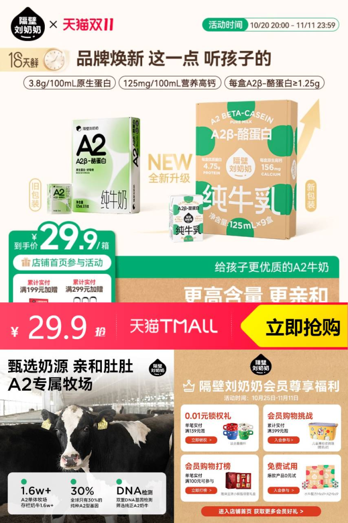 【叠加88vip1.5元 淘金币0.44元后,可以到26.96元。 89.7元/9支装*3箱-赠送定制奶托*1】A2β-酪蛋白,好吸收更营养,高钙配方。