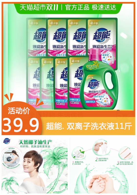 猫超×超能洗衣液神价!!1瓶8袋(共11斤)才39.9!!是双离子洗衣液!让衣物护色增亮~低泡沫易漂洗,比平常洗衣液好用的多,有好价就囤!